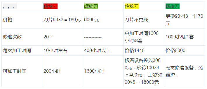 綜上結(jié)論傳統(tǒng)刀具每小時14.27元,螺旋刀具每小時3.75元,還沒算上節(jié)約的電量,螺旋刀切削阻力值是傳統(tǒng)刀具1/3可節(jié)約電量30%大大降低生產(chǎn)成本,六個月后螺旋刀片可拆下來修磨成本還可以大幅度下降。